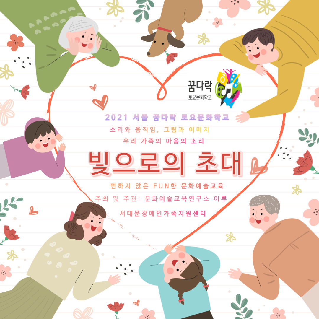 대상 : 장애 아동과 가족 (보호자 1인) 운영기간 : 2021.08.07.~ 09.11 매주 토요일 1기 : 10시30분 ~12시30분 2기 : 13시30분 ~15시30분 참가비 : 무료 장소 : 서대문장애인가족지원센터 문의 : 010-7655-8830 (문자신청) 주최 및 주관 : 문화예술교육연구소 이루