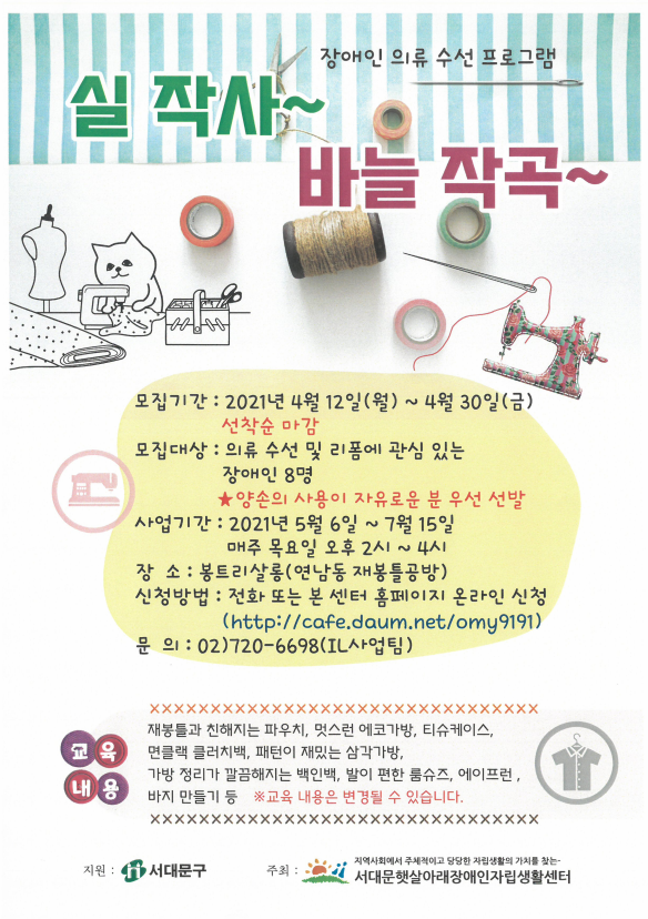 서대문햇살아래 장애인자립지원센터장애인에서는 복지단체사업의 일환 으로 장애인 의류 수선 프로그램을 진행하고자 합니다. 많은 관심과 참여 바랍니다.