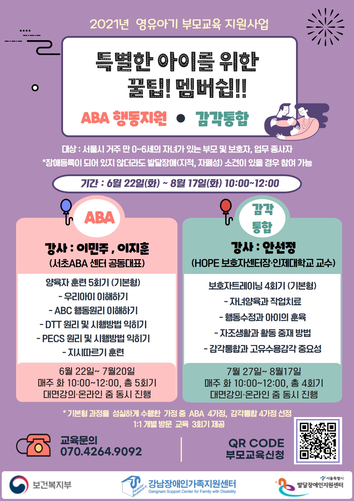 강남장애인가족지원센터에서 발달이 느린 자녀의 건강하고 독립적인 성장을 돕기 위한 영유아기 부모교육 "특별한 아이를 위한 꿀팁! 멤버쉽!!" 참가자를 모집합니다. 본 부모교육은 서울시발달장애인지원센터 영유아기 부모교육 지원사업으로 'ABA 행동지원' 과 ' 감각통합' 에 대한 부모교육이 9회기 동안 진행 됩니다. 서...
