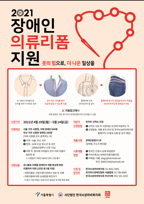 2021년 장애인의류리폼지원사업 가. 사 업 명 : 2021년 뇌병변 장애인의류리폼지원사업 나. 신청기간 : 2021. 4. 19.(월) ~ 5. 14.(금) 다. 대 상 : 서울시 거주 뇌병변, 지체 장애인 600명 14세이상 청소년 및 성인(2008년생부터 신청가능) 의류 착·탈의에 어려움이 있어 의류 리폼이 필요한 분 ※ 리폼없이 의류만 필요한...